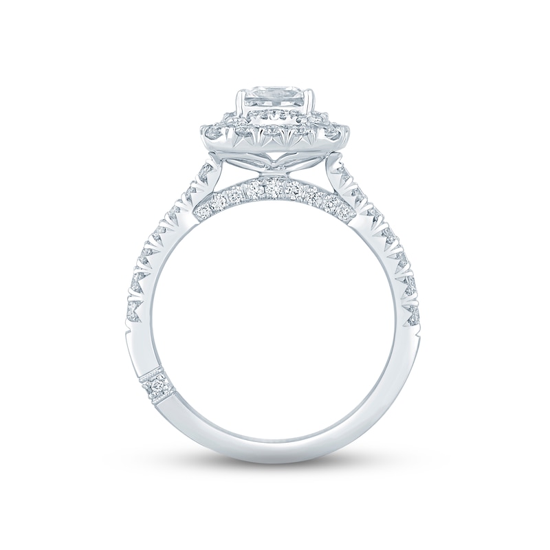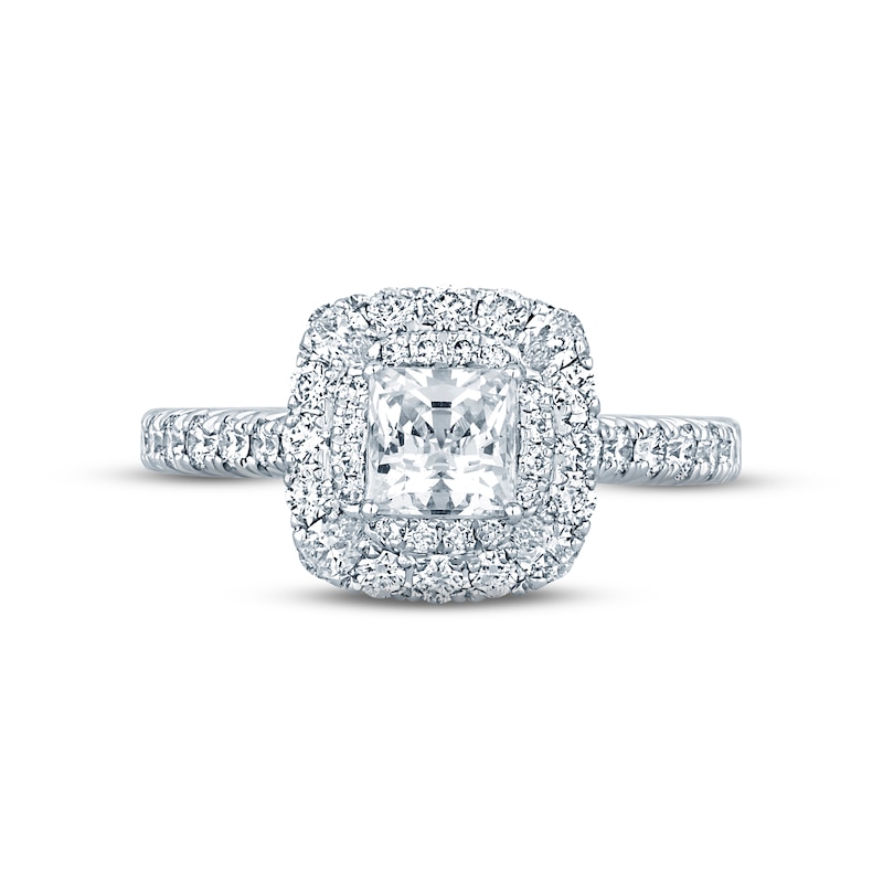 This breathtaking engagement ring displays a radiant 3/4-carat princes-cut diamond embraced by a dazzling double frame of round and pear-shaped diamonds. Brilliant round diamonds gleam along the band and across the bridge for a total diamond weight of 1 5/8 carats. The ring is crafted in 18K white gold and is finished by classic milgrain detailing. The independently certified center diamond is laser-inscribed with a unique Gemscribe® serial number to ensure your peace of mind. From the Monique Lhuillier Bliss collection, available exclusively at KAY. Please note: This ring is available in limited sizes. If you don't see your size here, please visit a store to order your ring.