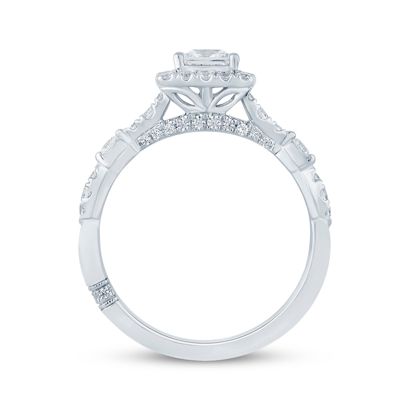Give her all the glamour she could want with this splendid 18K white gold engagement ring. A sparkling 1/2-carat princess-cut diamond draws the eye, surrounded by a squared framed of round diamonds. More round diamonds dance down the band and across the bridge for a total diamond weight of 1 carat. The independently certified center diamond is laser-inscribed with a unique Gemscribe® serial number to ensure your peace of mind. From the Monique Lhuillier Bliss collection, available exclusively at KAY. Please note: This ring is available in limited sizes. If you don't see your size here, please visit a store to order your ring.