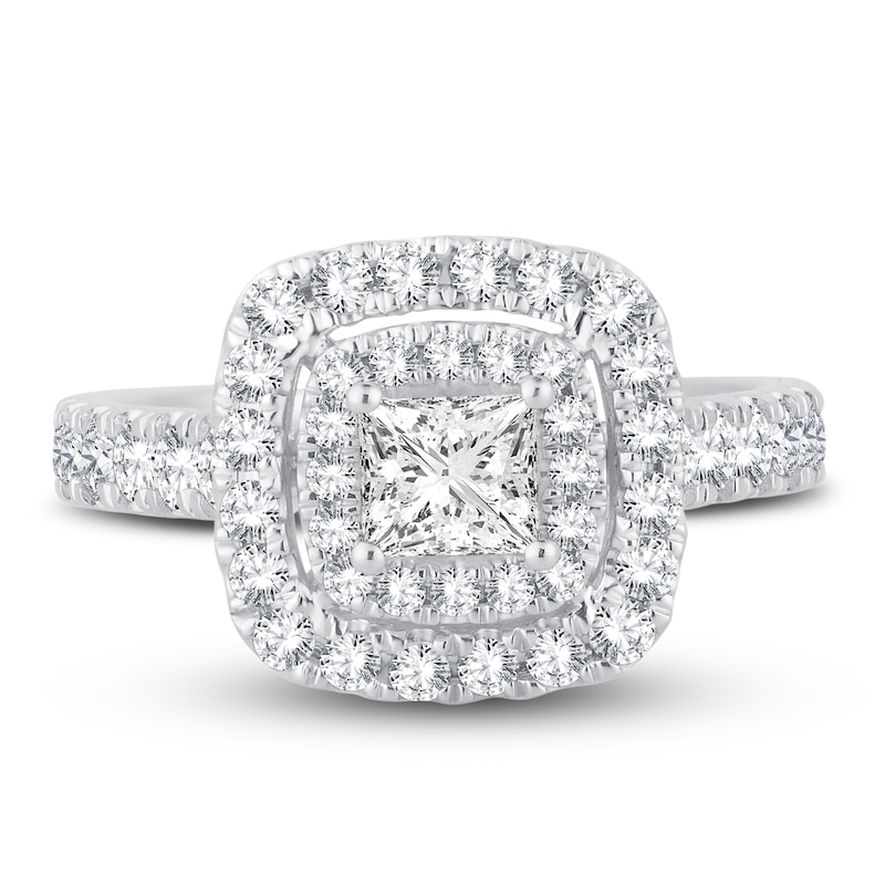 They'll be swept away (and say YES!) with the breathtaking sparkle of this diamond engagement ring. An exquisite princess-cut diamond forms a remarkable focal point when embraced with duo halos of shimmering round-cut diamonds. For a delightful finish, extra round diamonds adorn the polished 14K white gold band. The ring has a total diamond weight of 1 1/2 carats and is from our Now & Forever® bridal collection.