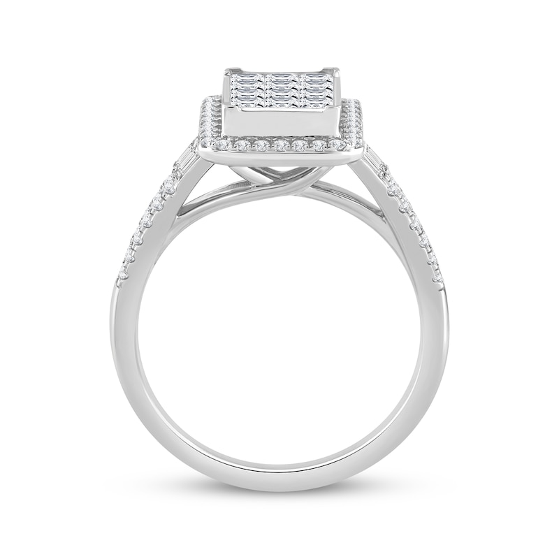 Surprise and delight with this spectacular engagement ring. Crafted in 14K white gold, the bold style is centered with a rectangular composite of princess-cut diamonds in a polished metal frame. A ribbon of round-cut diamonds wraps the center stones, creating an elongated cushion silhouette. Pairs of baguette-cut diamonds flank the centerpiece, while dual rows of round-cut diamonds lend shimmer to the shank. This dazzling design has a total diamond weight of 1 carat. From the Now & Forever® bridal collection.