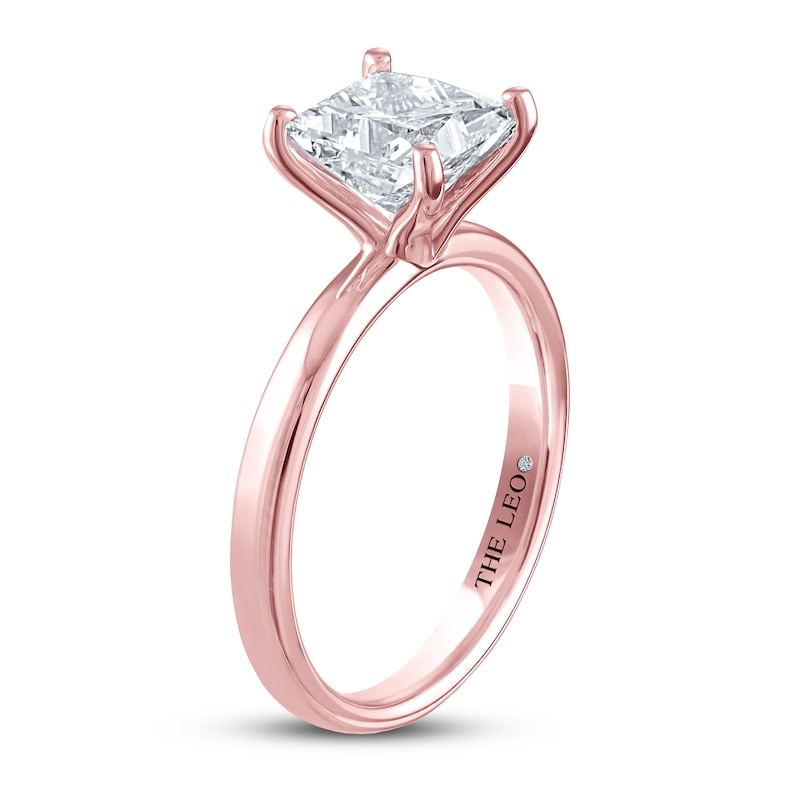 This gorgeous solitaire engagement ring from THE LEO Artisan collection showcases a breathtaking princess-cut, independently-certified 2-carat diamond at its center. The ring is crafted in dreamy 14K rose gold. This Leo Diamond Artisan solitaire engagement ring has a score of three Very High ratings on the GemEx Light Performance Report, and the center diamond is laser-inscribed with a unique Gemscribe® number for your peace of mind.