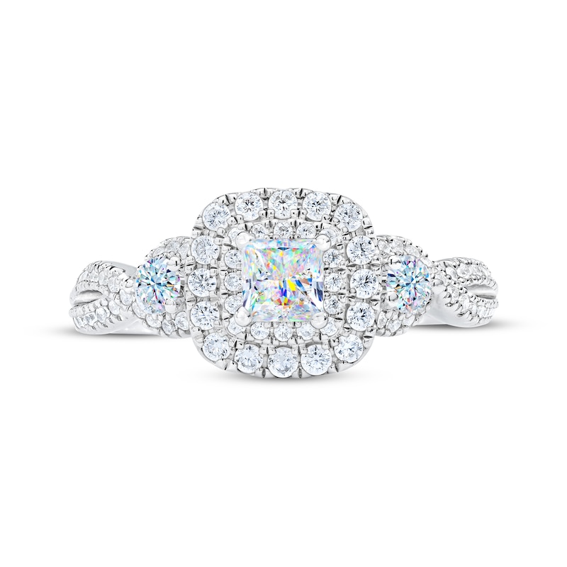 Show your love with this incredible THE LEO First Light® Diamond engagement ring. Crafted in 14K white gold, the design showcases a 3/8-carat princess-cut diamond wrapped in a double cushion-shaped halo of round-cut diamonds. More round diamonds adorn the split twist shank for added shimmer. Each independently certified diamond features Fire Prism™ technology, creating infinite flashes of color for more fire and sparkle. This gorgeous ring has a total diamond weight of 1 carat. The center diamond is laser-inscribed with a unique Gemscribe® serial number to ensure your peace of mind. Live Your Love in Color™.