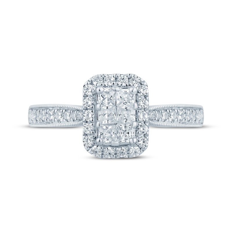 Hone in on her love for heirloom style with this inspiring engagement ring, Crafted in 14K white gold, the centerpiece sparkles with six stacked princess-cut diamonds. A ribbon of round-cut diamonds creates a dazzling frame, while more round diamonds decorate the pinched and milgrain-detailed shank. This vintage design has a total diamond weight of 1/2 carat. From the Now & Forever® bridal collection.