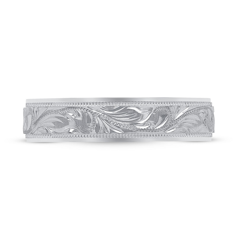 Engraved flourishes and milgrain detail add a vintage-inspired look to this distinctive wedding band. Crafted of platinum, a metal prized for its luster and durability, the ring is available in sizes for men and women. The band is 5mm in width.