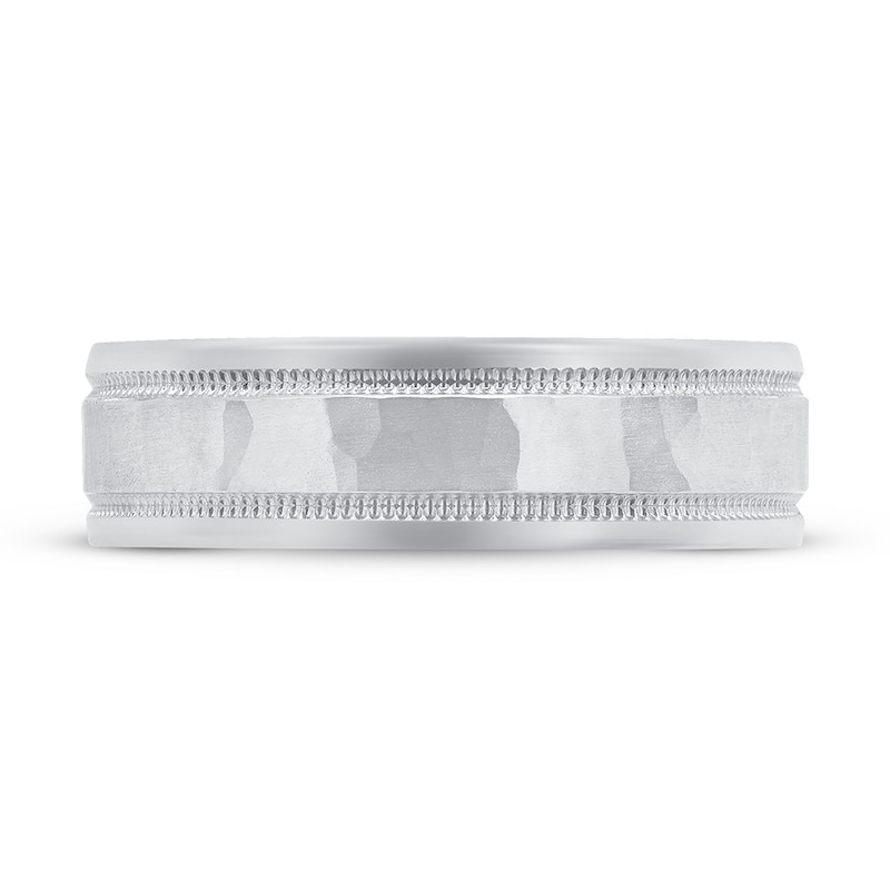 Textured lines define the hammered-style center of this modern wedding band, available in sizes for men and women. The 6mm band is crafted of platinum, a metal prized for its luster and durability.