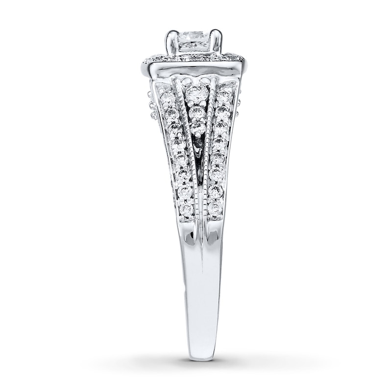 This stunning diamond engagement ring features a 3/8 carat princess-cut center diamond, surrounded by brilliant round diamonds. Additional round diamonds fill the sides of the ring. Milgrain edging supplies the finishing touch. Crafted in beautiful 14K white gold, the ring has a total diamond weight of 1 carat. Available online while supplies last. Previously Owned Treasures are not eligible for in-store pickup. Previously Owned Treasures may only be shipped either to your home address or to an alternate address. Price comparison based on new item pricing.