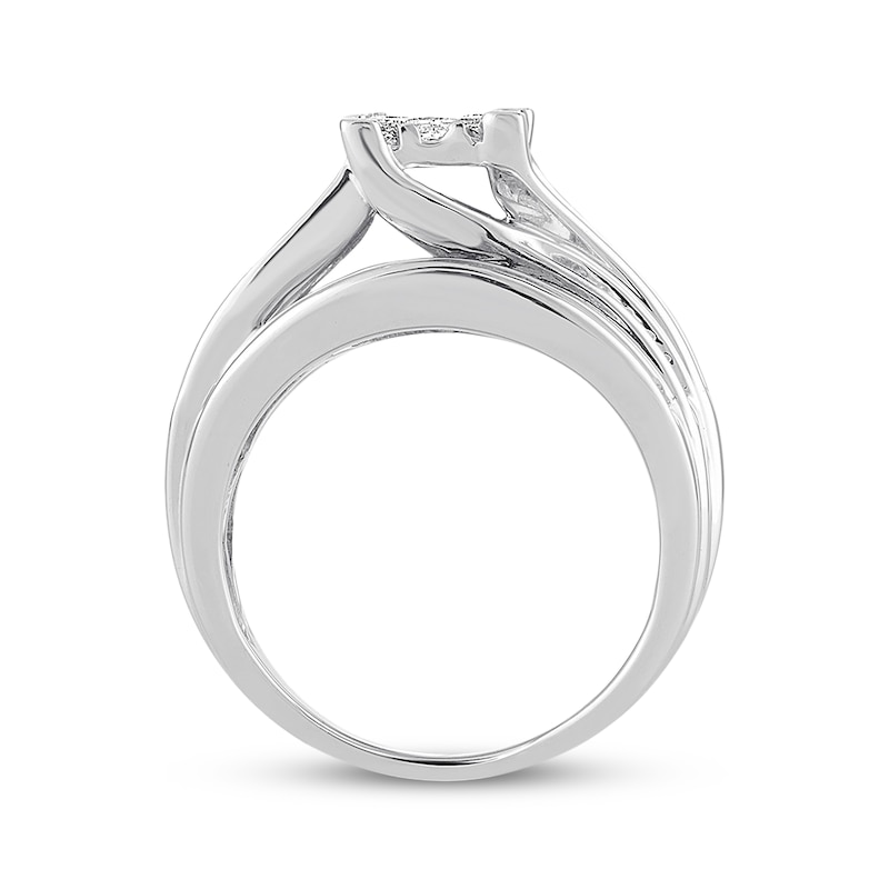Tightly nestled princess-cut diamonds capture attention in the center of this dazzling engagement ring. Sparkling waves of round diamonds create the graceful band to complement. Fashioned in beautiful 10K white gold, the ring has a total diamond weight of 1 carat. Available online while supplies last. Previously Owned Treasures are not eligible for in-store pickup. Previously Owned Treasures may only be shipped either to your home address or to an alternate address.