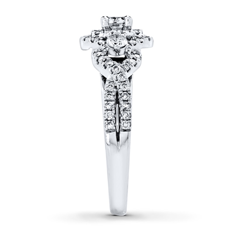 This engagement ring for her is awash in breathtaking round diamonds with a total weight of 1 carat. The ring is styled in beautiful 14K white gold. Available online while supplies last. Previously Owned Treasures are not eligible for in-store pickup. Previously Owned Treasures may only be shipped either to your home address or to an alternate address. Price comparison based on new item pricing.