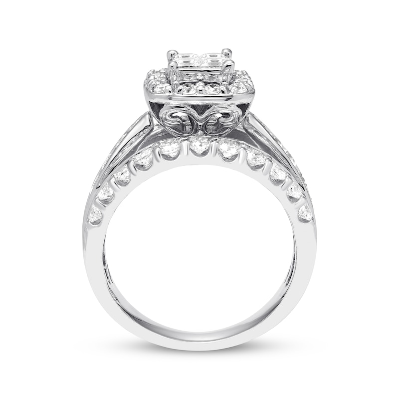 Love is worth celebrating, and what better way than with this incredible engagement ring? The center showcases four princess-cut diamonds haloed by round diamonds for even more sparkle. Brilliant lines of round diamonds create a stylish layered look on the band to complement. Fashioned in beautiful 14K white gold, the ring has a total diamond weight of 2 carats. Available online while supplies last. Previously Owned Treasures are not eligible for in-store pickup. Previously Owned Treasures may only be shipped either to your home address or to an alternate address.