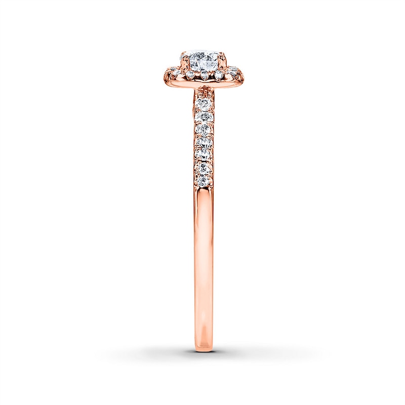 A 1/4 carat round diamond is framed by additional round diamonds in this captivating engagement ring for her. More sparkling round diamonds line the band of 10K rose gold, bringing the total diamond weight of the ring to 3/8 carat. Available online while supplies last. Previously Owned Treasures are not eligible for in-store pick-up. Previously Owned Treasures may only be shipped either to your home address or to an alternate address.
