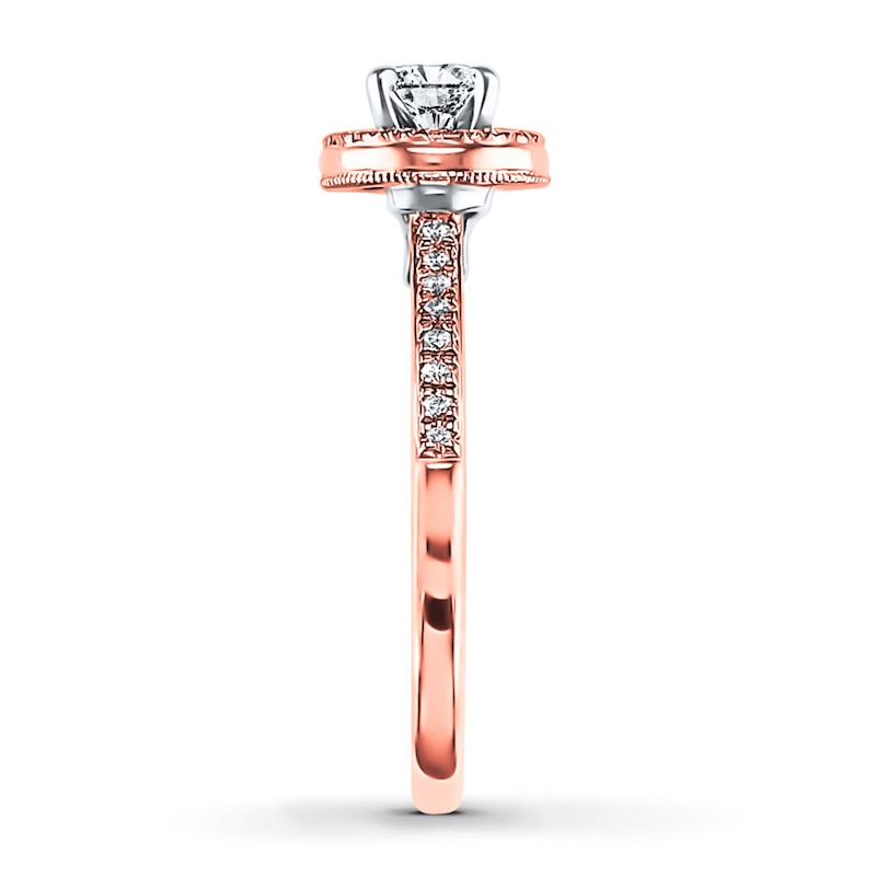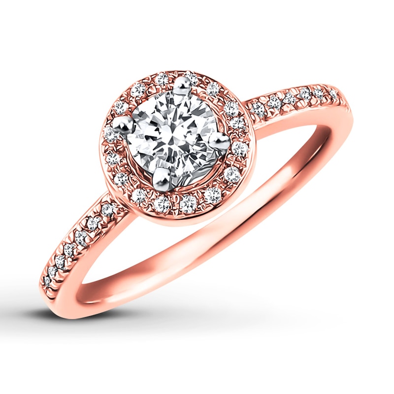 A 1/2-carat round diamond is the wondrous focal point of this brilliant 14K rose gold engagement ring for her. Round diamonds glisten around the center and along the band for a total diamond weight of 5/8 carat. Curves of 14K white gold adorn the profile to complete the look. Available online while supplies last. Previously Owned Treasures are not eligible for in-store pickup. Previously Owned Treasures may only be shipped either to your home address or to an alternate address.