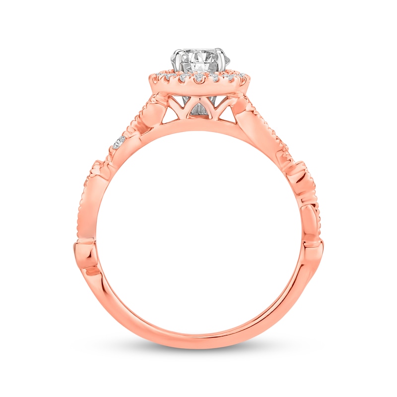 This beautiful engagement ring is a sparkling declaration of your love. A 1/2-carat round diamond set in 14K white gold is haloed by more diamonds to create the glittering focal point. The floral-inspired band features milgrain flourishes embellished with glistening diamonds and petal-shaped frames. Styled in feminine 14K rose gold, the ring has a total diamond weight of 5/8 carat. Available online while supplies last. Previously Owned Treasures are not eligible for in-store pickup. Previously Owned Treasures may only be shipped either to your home address or to an alternate address. Price comparison based on new item pricing.