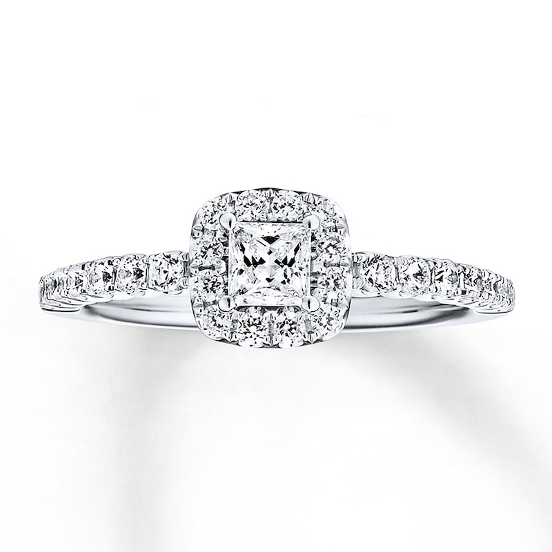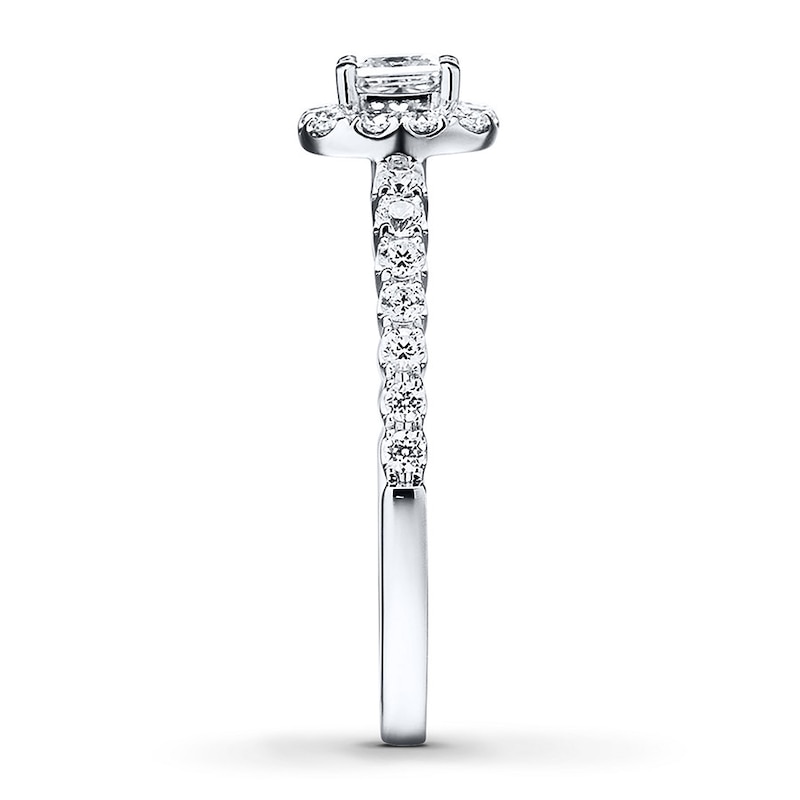 The sparkling center of this pretty engagement ring features a princess-cut diamond haloed by shimmering round diamonds. The 14K white gold band glistens with additional round diamonds, bringing the total weight of the ring to 5/8 carat. Available online while supplies last. Previously Owned Treasures are not eligible for in-store pick-up. Previously Owned Treasures may only be shipped either to your home address or to an alternate address. Price comparison based on new item pricing.
