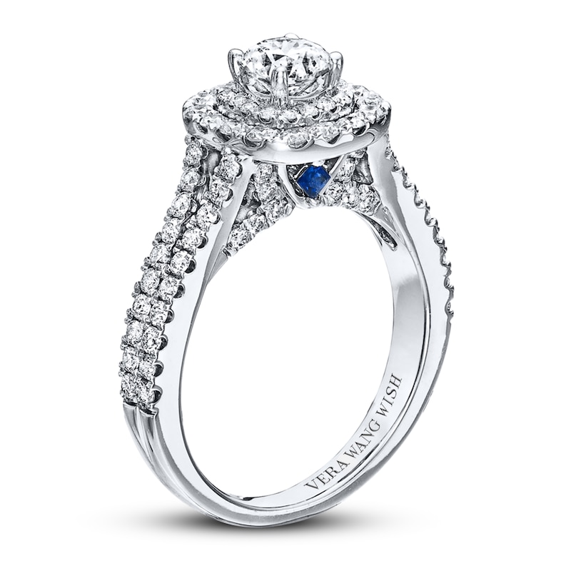 This remarkable ring features a 1/2 carat round center diamond framed with smaller accent diamonds. Two princess-cut sapphires, the signature of the collection and a symbol of faithfulness and everlasting love, are set into the ring's bezel. The split band is also lined with sparkling accent diamonds, completing this exquisite look. Set in 14K white gold with 1 1/2 carats total weight of diamonds, this engagement ring is a brilliant beginning to your romantic love story. Available online while supplies last. Previously Owned Treasures are not eligible for in-store pickup. Previously Owned Treasures may only be shipped either to your home address or to an alternate address. Price comparison based on new item pricing.