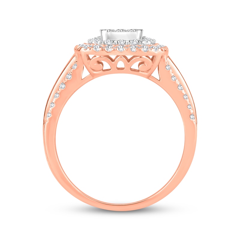 A gorgeous array of princess-cut diamonds forms the sparkling center of this chic engagement ring. Set in beautiful two-tone gold, the center design is haloed by brilliant round diamonds in 10K white gold. Another frame of round diamonds shines in 10K rose gold, and the band showcases more round diamonds. The ring has a total diamond weight of 1 carat. Available online while supplies last. Previously Owned Treasures are not eligible for in-store pickup. Previously Owned Treasures may only be shipped either to your home address or to an alternate address. Price comparison based on new item pricing.