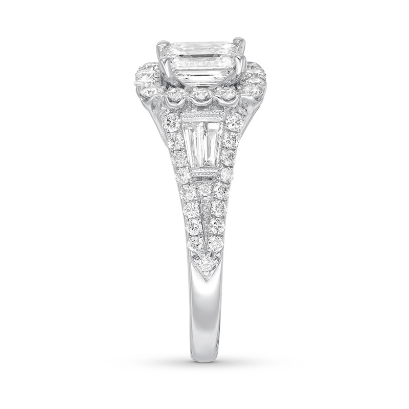 A stellar emerald-cut diamond is framed in lovely round diamonds at the center of this engagement ring from Neil Lane Bridal®. Baguette diamonds adorn each side of the center, with round diamonds flowing along the band of 14K white gold. The ring has a total diamond weight of 1 7/8 carats. Available online while supplies last. Previously Owned Treasures are not eligible for in-store pickup. Previously Owned Treasures may only be shipped either to your home address or to an alternate address.
