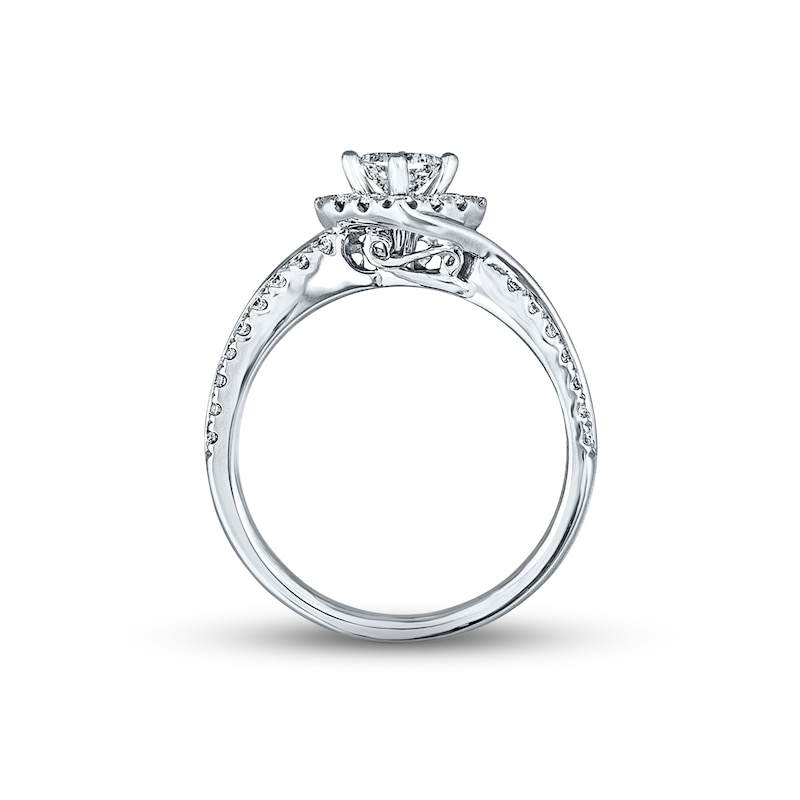 Round diamonds frame the independently certified princess-cut diamond center of this spellbinding engagement ring from THE LEO Diamond®. Ribbons of 14K white gold and round diamonds flow along the band, bringing the total diamond weight to 3/4 carat. The center diamond is laser-inscribed with a unique Gemscribe® serial number. Available online while supplies last. Previously Owned Treasures are not eligible for in-store pick-up. Previously Owned Treasures may only be shipped either to your home address or to an alternate address. Price comparison based on new item pricing.