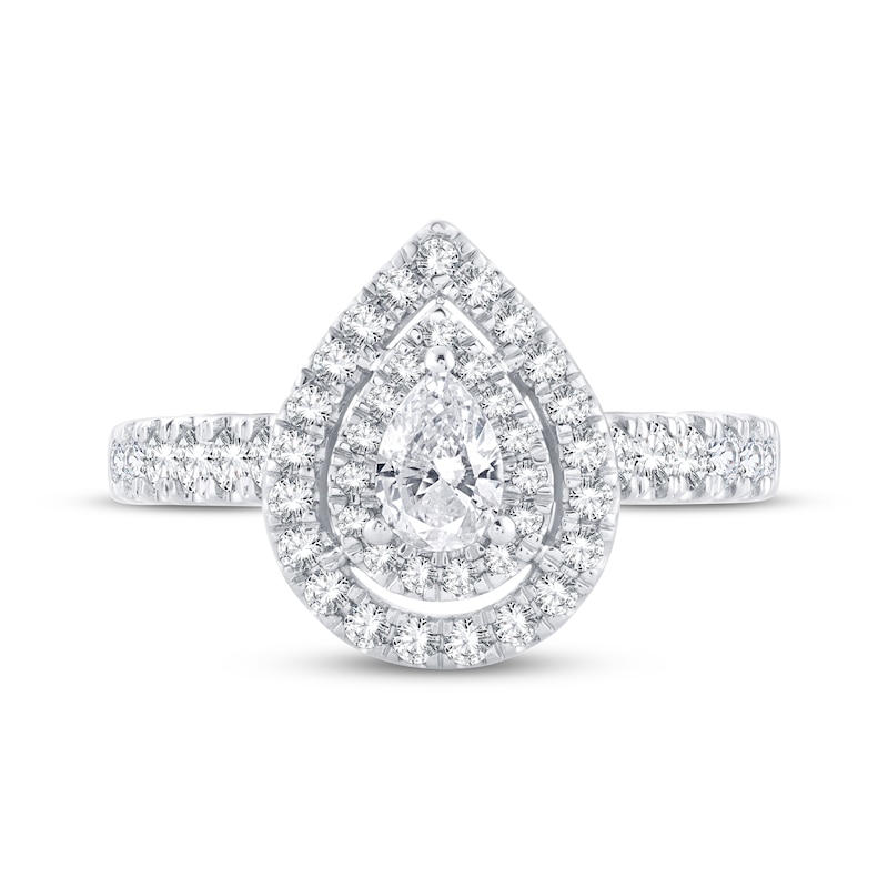 A striking symbol of your everlasting love, this gorgeous diamond engagement ring for her features a lovely center pear-shaped diamond that is framed with 2 halos of sparkling round diamonds. The striking 14K white gold band is dazzled with dancing round diamonds to complete the look and give the ring a total diamond weight of 1 carat. From the Now & Forever® bridal collection. Available online while supplies last. Previously Owned Treasures are not eligible for in-store pick-up. Previously Owned Treasures may only be shipped either to your home address or to an alternate address.