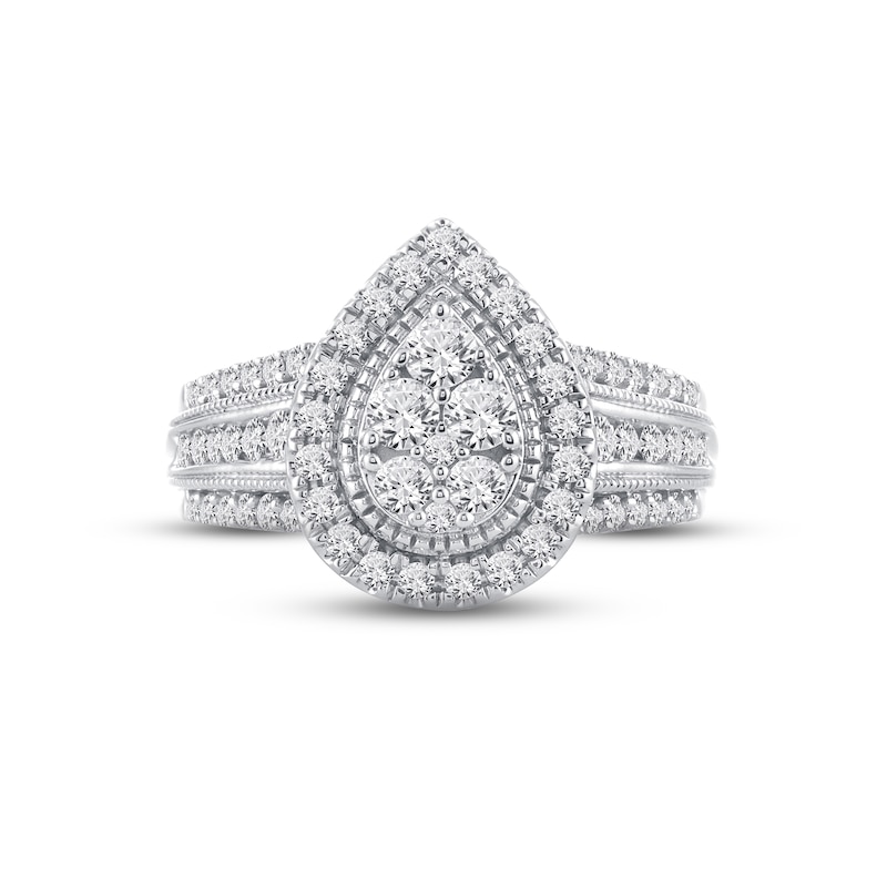 This exquisite engagement ring for her features a pear-shaped design embellished with sparkling round-cut diamonds at its center. More round-cut diamonds halo the center, and more round diamonds drizzle down each side of the 10K white gold band. The ring has a total diamond weight of 1 carat. Available online while supplies last. Previously Owned Treasures are not eligible for in-store pick-up. Previously Owned Treasures may only be shipped either to your home address or to an alternate address. Price comparison based on new item pricing.