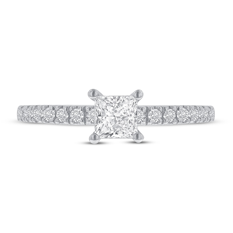 This captivating diamond engagement ring for her is fashioned in 14K white gold and showcases a striking princess-cut diamond in the center. The ring is embellished with more sparkling round diamonds that sweep along the band to complete the look, bringing the total diamond weight to 5/8 carat. Available online while supplies last. Previously Owned Treasures are not eligible for in-store pickup. Previously Owned Treasures may only be shipped either to your home address or to an alternate address. Price comparison based on new item pricing.