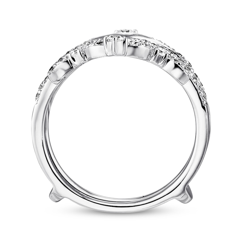 A stunningly modern addition to your diamond solitaire or engagement ring (sold separately), this beautiful enhancer ring features chevrons of 14K white gold adorned with sparkling round diamonds. More glittering diamonds and tapered ovals complete the look. The ring has a total diamond weight of 1/2 carat. Available online while supplies last. Previously Owned Treasures are not eligible for in-store pickup. Previously Owned Treasures may only be shipped either to your home address or to an alternate address.