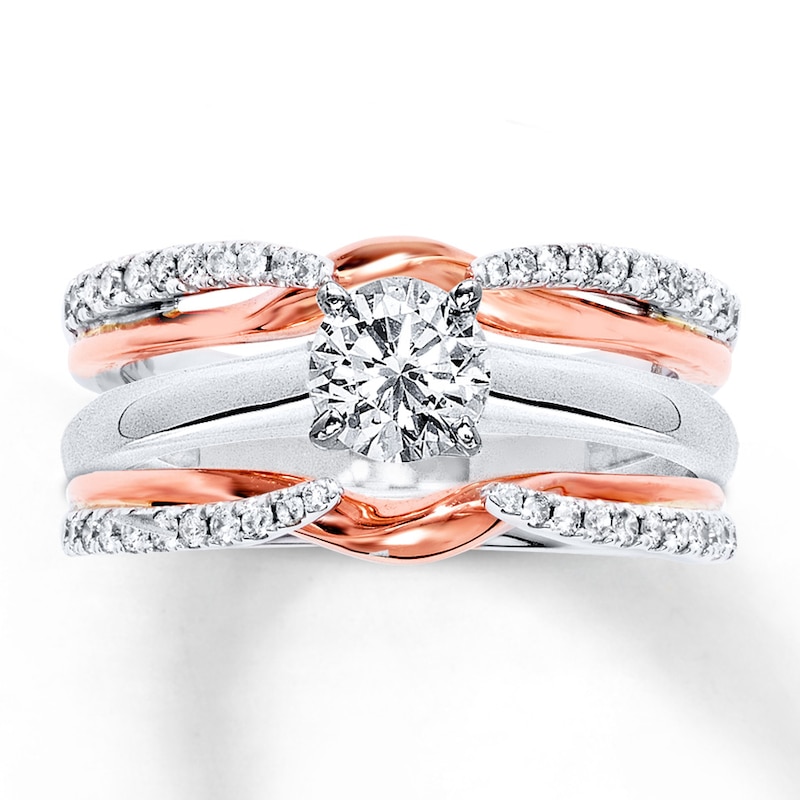 Ribbons of 14K white gold lined with diamonds hover over ribbons of 14K rose gold to form this stunning enhancer ring for her. The ring has a total diamond weight of 1/3 carat. Available online while supplies last. Previously Owned Treasures are not eligible for in-store pickup. Previously Owned Treasures may only be shipped either to your home address or to an alternate address. Price comparison based on new item pricing.