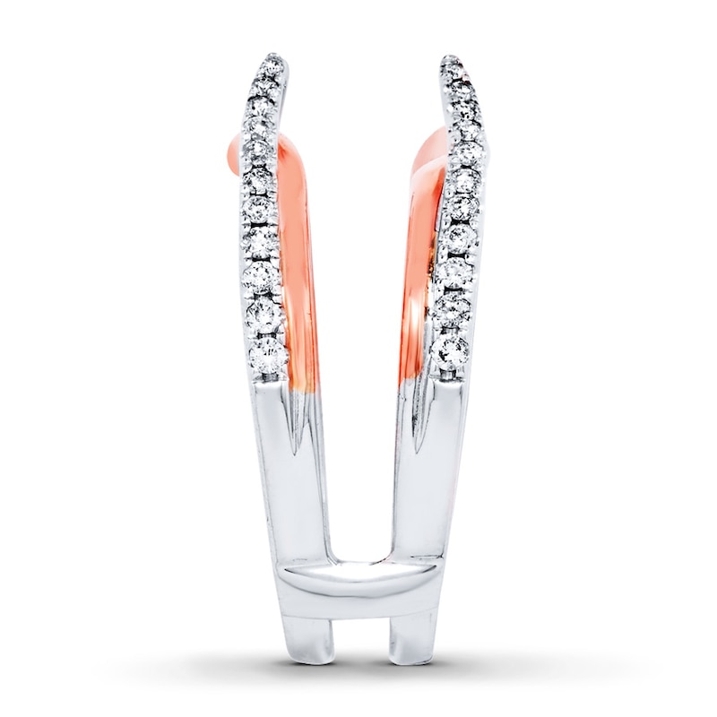 Ribbons of 14K white gold lined with diamonds hover over ribbons of 14K rose gold to form this stunning enhancer ring for her. The ring has a total diamond weight of 1/3 carat. From the Adore® Bridal Collection. Available online while supplies last. Previously Owned Treasures are not eligible for in-store pickup. Previously Owned Treasures may only be shipped either to your home address or to an alternate address. Price comparison based on new item pricing.