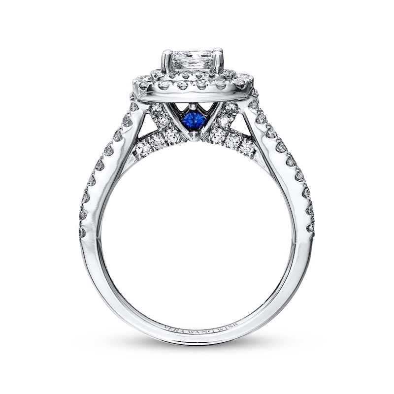 This captivating engagement ring features a 1/2 carat princess-cut center diamond glittering in a double frame set with smaller accent diamonds. Two square-cut sapphires, the signature of the collection and a symbol of faithfulness and everlasting love, are set into the ring's bezel. The split band is also lined with sparkling accent diamonds, completing this exquisite look. Set in 14K white gold with 1 1/2 carats total weight of diamonds, this engagement ring is a brilliant beginning to your romantic love story. Available online while supplies last. Previously Owned Treasures are not eligible for in-store pick-up. Previously Owned Treasures may only be shipped either to your home address or to an alternate address. Price comparison based on new item pricing.