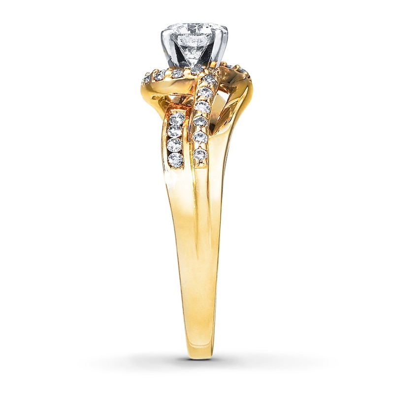 Swirls of round diamonds embrace the round diamond center of this enthralling ring for her. Two rows of additional round diamonds flow along the band to complete the look. Styled in sumptuous 14K yellow gold, the ring has a total diamond weight of 5/8 carat. From the Now & Forever® Bridal Collection. Available online while supplies last. Previously Owned Treasures are not eligible for in-store pick-up. Previously Owned Treasures may only be shipped either to your home address or to an alternate address. Price comparison based on new item pricing.