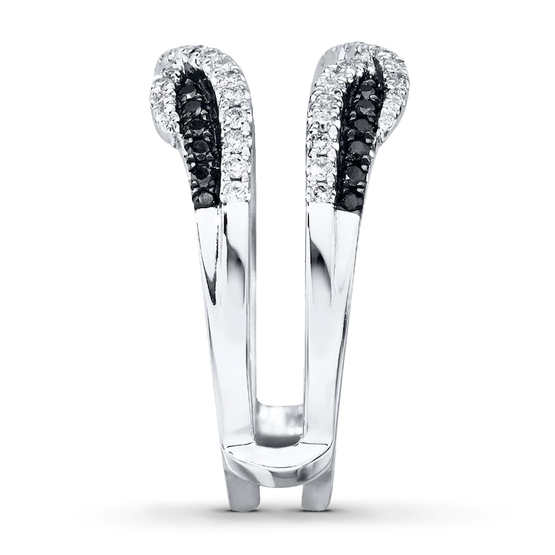 This dazzling enhancer ring for her features black diamonds and ribbons of round white diamonds intermingling above and below an insert for her solitaire engagement ring (sold separately). The ring is styled in 14K white gold and has a total diamond weight of 1/2 carat. Available online while supplies last. Previously Owned Treasures are not eligible for in-store pick-up. Previously Owned Treasures may only be shipped either to your home address or to an alternate address.
