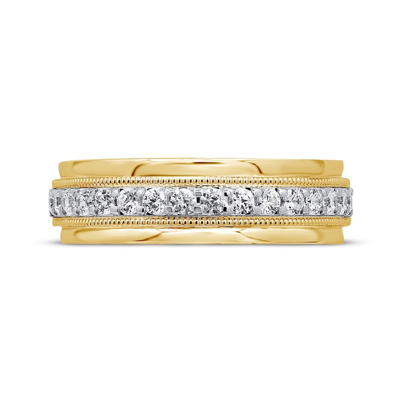 Beautiful round diamonds dazzle at the center of this handsome men's wedding band. The 10K yellow gold ring charms with a white rhodium flash and classic milgrain detailing to frame the diamonds. The ring has a total diamond weight of 1/2 carat. Available online while supplies last. Previously Owned Treasures are not eligible for in-store pickup. Previously Owned Treasures may only be shipped either to your home address or to an alternate address. Price comparison based on new item pricing.