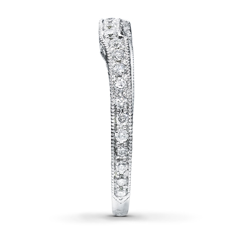From the Neil Lane Bridal® collection, brilliant round diamonds flow along this lovely 14K white gold wedding band for her, which is contoured to fit the matching diamond engagement ring (sold separately). The ring has a total diamond weight of 1/3 carat. Available online while supplies last. Previously Owned Treasures are not eligible for in-store pickup. Previously Owned Treasures may only be shipped either to your home address or to an alternate address. Price comparison based on new item pricing.