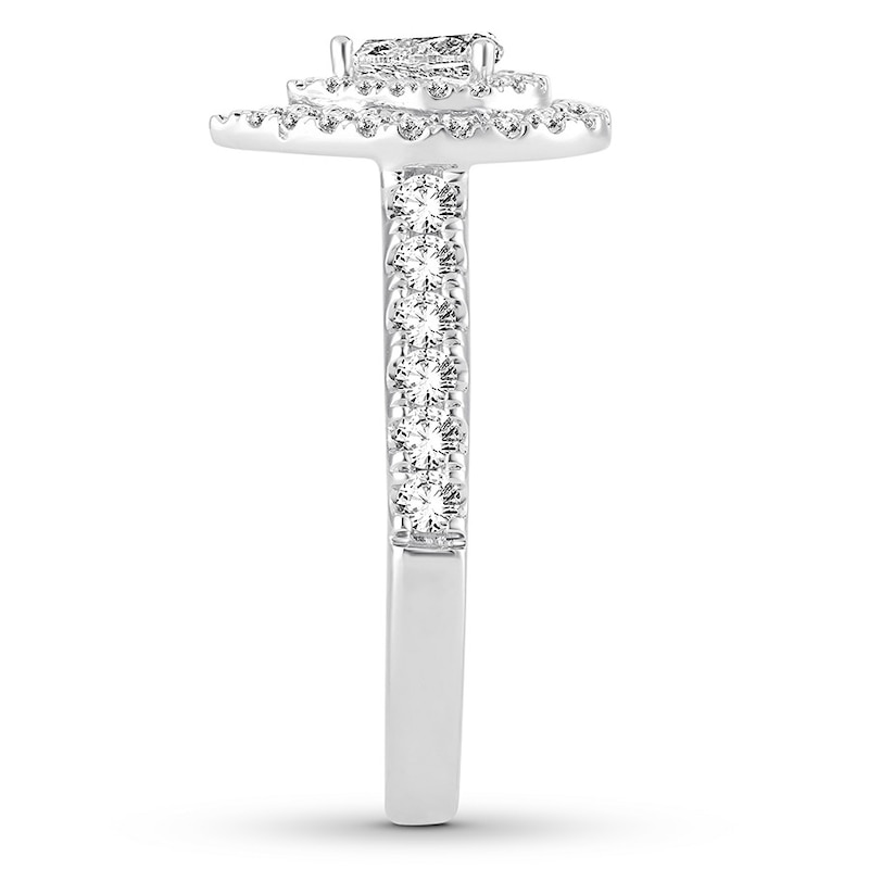 Layers of round diamonds envelop the 1/3 carat pear-shaped diamond at the center of this extraordinary engagement ring for her, crafted of 14K white gold. Round diamonds shimmer along the band, bringing the total diamond weight to 1 carat. Available online while supplies last. Previously Owned Jewelry is not eligible for in-store pick-up. Previously Owned Jewelry may only be shipped either to your home address or to an alternate address.