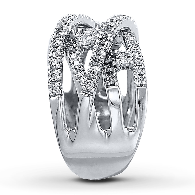Five bands of 14K white gold dressed with nearly 70 diamonds interweave in this fashionable diamond ring for her. Four additional round diamonds sparkle between the bands to provide added sophistication. This dramatic ring has a total diamond weight of 1 carat. Available online while supplies last. Previously Owned Treasures are not eligible for in-store pick-up. Previously Owned Treasures may only be shipped either to your home address or to an alternate address. Price comparison based on new item pricing.
