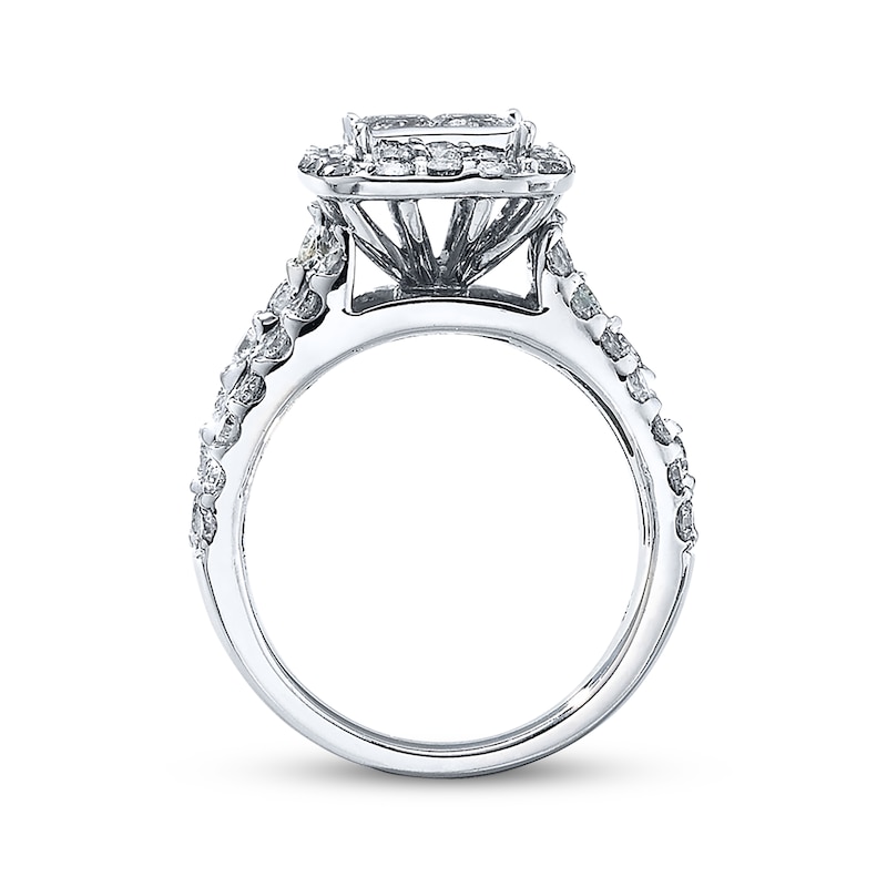 A quartet of sparkling princess-cut diamonds is framed by brilliant round diamonds in the center of this spectacular diamond engagement ring for her. Three rows of additional round diamonds grace either side of the 14K white gold band. The total diamond weight of the ring is 3 carats. Available online while supplies last. Previously Owned Treasures are not eligible for in-store pick-up. Previously Owned Treasures may only be shipped either to your home address or to an alternate address. Price comparison based on new item pricing.