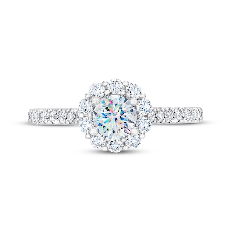 A brilliant 1/2-carat round-cut First Light® diamond sparkles at the center of this beautiful engagement ring for her. From Leo Schachter, the independently-certified diamond features Fire Prism™ technology that creates infinite flashes of color for more fire and sparkle. Beautiful round-cut diamonds frame the center, and more dazzle down each side of the 14K white gold band for a total diamond weight of 1 carat. The center diamond is laser-inscribed with a unique Gemscribe® serial number to ensure your peace of mind. Live Your Love in Color.™ Available online while supplies last. Previously Owned Treasures are not eligible for in-store pickup. Previously Owned Treasures may only be shipped either to your home address or to an alternate address.