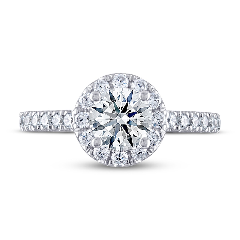 Introducing THE LEO® Ideal Cut Diamond, a rare diamond of geometrically perfect proportions that releases the maximum amount of fire, sparkle and brilliance – to let your unique love for each other truly shine through. This beautiful diamond engagement ring for her features a 1-carat independently-certified, round-cut diamond at its center, surrounded by a striking halo of round diamonds. More brilliant round-cut diamonds sparkle down each side of the chic 14K white gold band, giving the ring a total diamond weight of 1 1/3 carats. Available online while supplies last. Previously Owned Treasures are not eligible for in-store pickup. Previously Owned Treasures may only be shipped either to your home address or to an alternate address. Price comparison based on new item pricing.