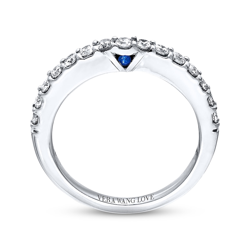 This captivating 14k white gold wedding band features 1/2 carat total weight of shimmering round diamonds. Two round sapphires, the signature of the collection and a symbol of faithfulness and everlasting love, are set into the ring's band at the top and bottom. Buffed to a brilliant shine, this timeless design is a dazzling symbol of your love and commitment. Available online while supplies last. Previously Owned Treasures are not eligible for in-store pick-up. Previously Owned Treasures may only be shipped either to your home address or to an alternate address. Price comparison based on new item pricing.