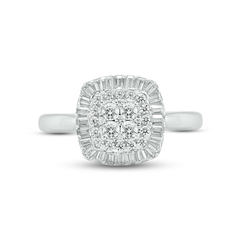 This captivating promise ring features an array of radiant round diamonds framed in baguette-cut diamonds, comprising a chic cushion silhouette. Styled in 10K white gold, the ring has a total diamond weight of 1/2 carat.