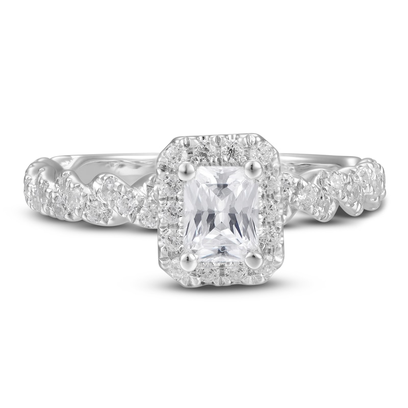 This stunning diamond engagement ring shines with a 1/2-carat radiant-cut diamond at its center. Brilliant round diamonds halo the center stone and shimmer down the twisted band for a total diamond weight of 1 carat. The ring is crafted in iconic 14K white gold and from our Now & Forever® bridal collection.