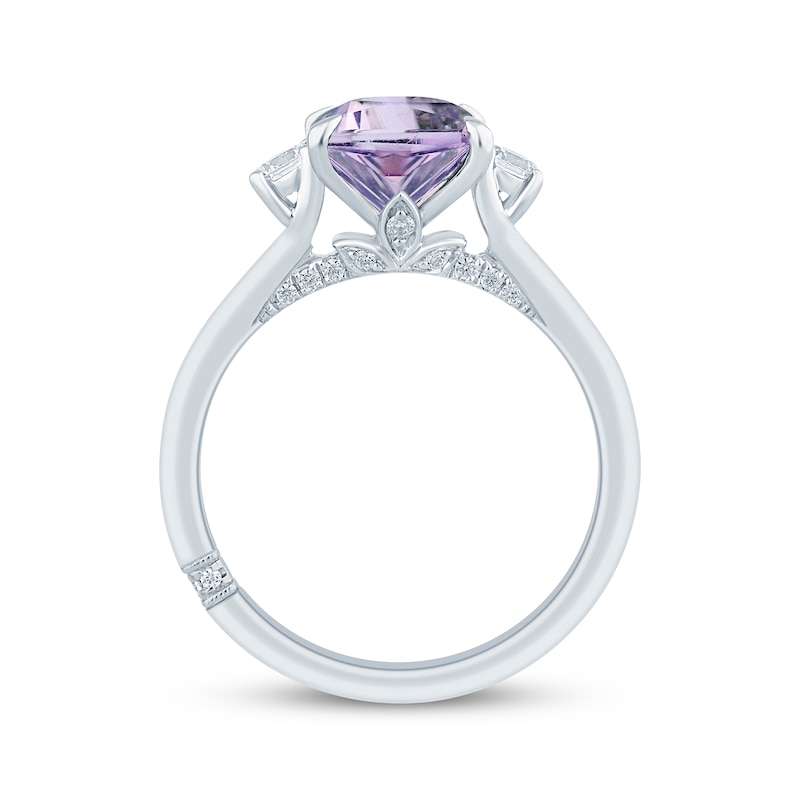 Embrace the dreamy hue of light amethyst in this splendid gemstone and diamond engagement ring. This exceptional style is crafted in 14K white gold. A radiant-cut light amethyst is the colorful centerpiece. A round-cut diamond glistens on each flank, while smaller round diamonds sparkle across the bridge and in a fleur-de-lis design on the gallery. A signature element of diamonds in milgrain detailing encircles the band, symbolizing unity and eternal love. The ring has a total diamond weight of 1/4 carat. From the Monique Lhuillier Bliss collection, available exclusively at KAY. Please note: This ring is available in limited sizes. If you don't see your size here, please visit a store to order your ring.