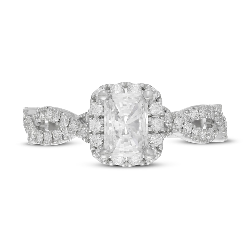 A breathtaking 3/4-carat radiant-cut diamond sparkles at the center of this luxe engagement ring for her. Set in iconic 14K white gold, the ring features a halo of brilliant round-cut diamonds, and more shimmer down the twisted band. The ring has a total diamond weight of 1 1/4 carats and finished with classic milgrain detailing. From the Neil Lane Bridal® collection.