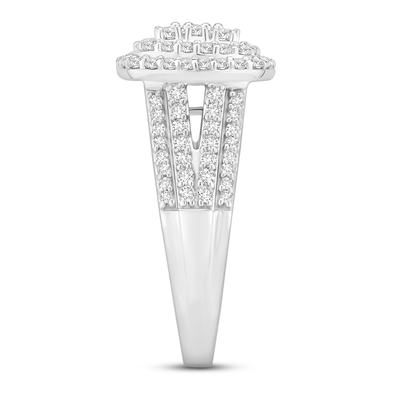 This entrancing engagement ring for her sparkles with a round cut center diamond surrounded by three rows of radiant round diamonds. Additional round diamonds sparkle along the split-shank 14K white gold band, bringing the total diamond weight to 1 carat. From the Now and Forever® bridal collection.