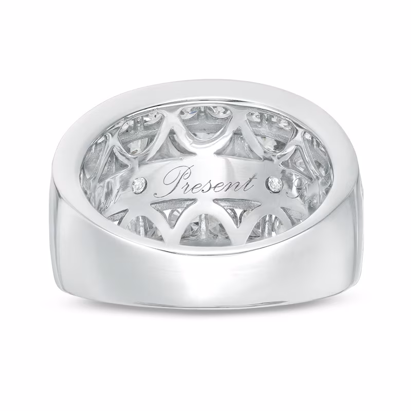 - The phrase "Past Present Future" shines along the inside of the shank with two accent diamonds.