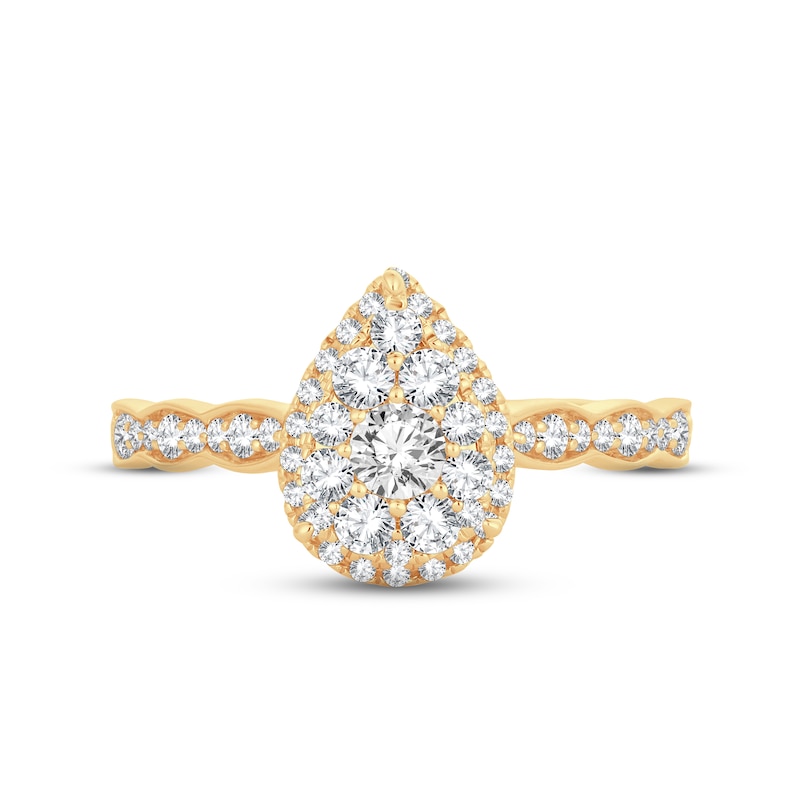 A brilliant round diamond twinkles at the center of this remarkable engagement ring, surrounded by glittering round diamonds that form an elegant pear-shaped design. Additional round diamonds grace the band, which is styled in timeless 14K yellow gold. The ring has a total diamond weight of 5/8 carat and is from the Now and Forever® bridal collection.