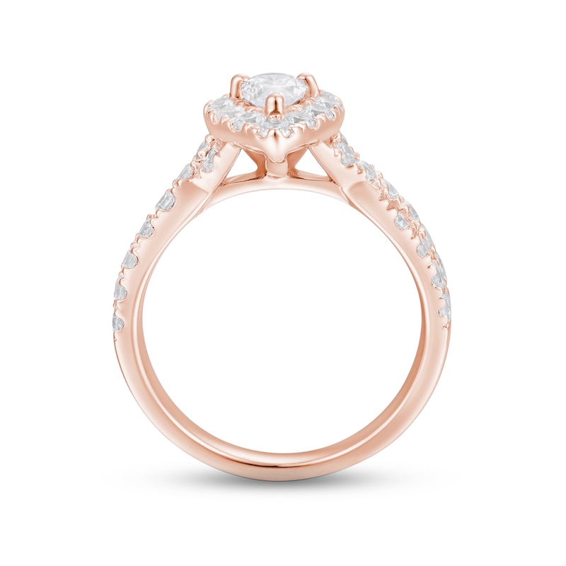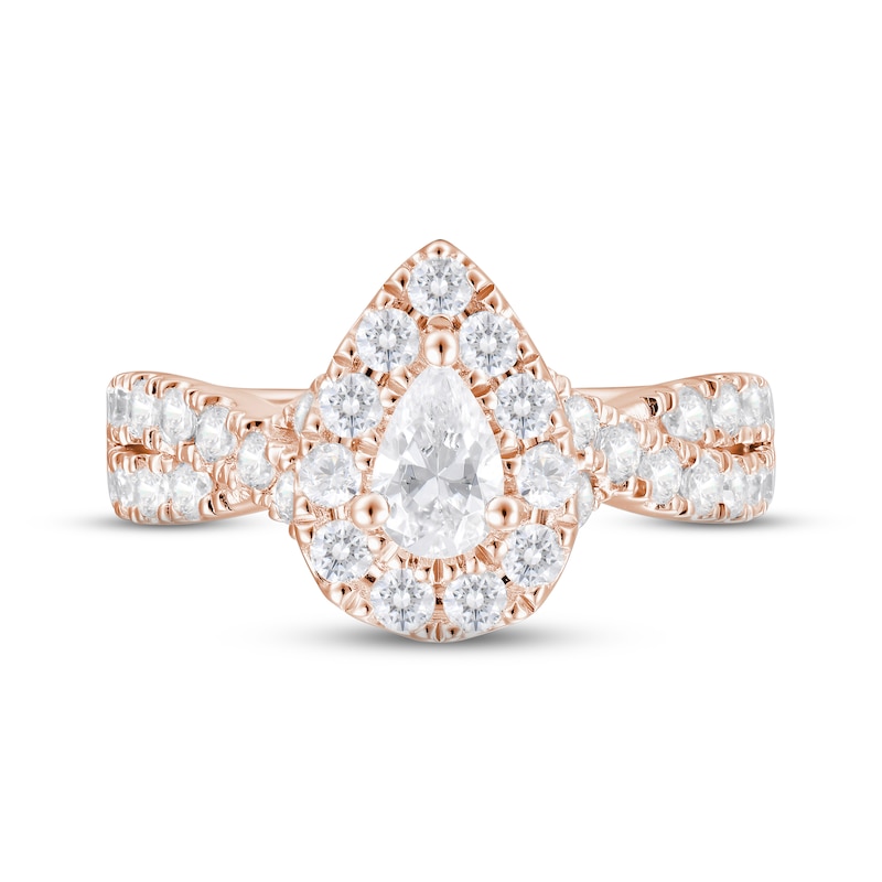 This romantic engagement ring is styled in dreamy 18K rose gold and showcases a gleaming 1/2-carat pear-shaped diamond at the center. Round diamonds form a sparkling halo and twist halfway down the band for a total diamond weight of 1 1/2 carats. From the Now & Forever® bridal collection.