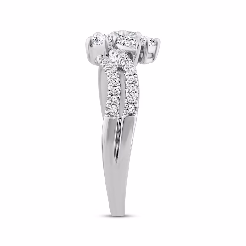 This enchanting diamond ring features five distinctively-shaped diamonds. The beautiful 10K white gold ring features an oval-cut, emerald-cut, pear-shaped, round-cut, and princess-cut diamond at the center, while ribbons of brilliant round-cut diamonds flow outward. The gorgeous ring has a total diamond weight of 1/2 carat.