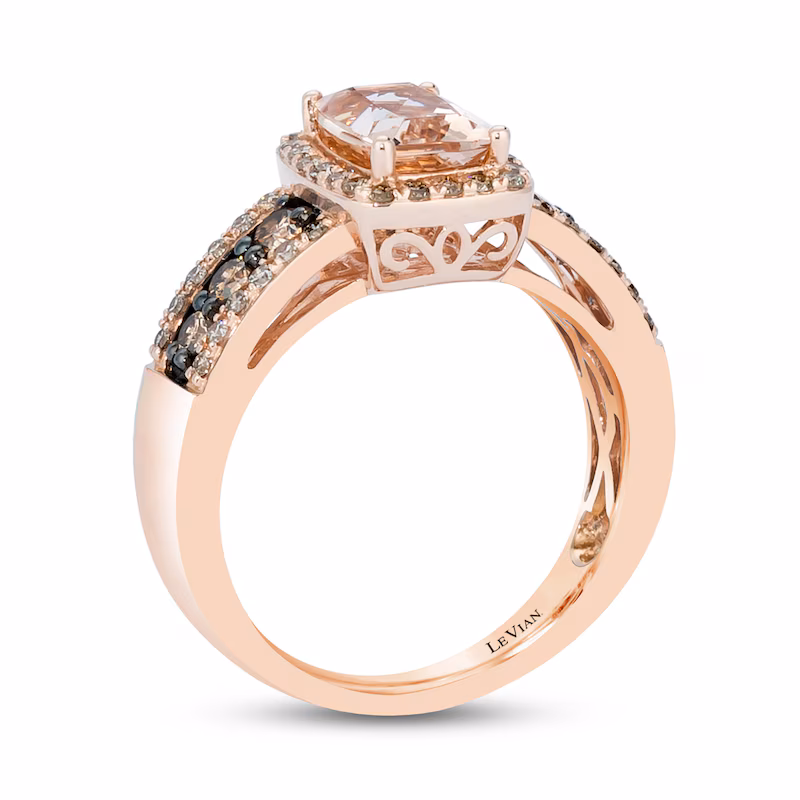A cushion-cut Peach Morganite⢠traced in Nude Diamonds⢠forms the sophisticated center of this stylish ring for her from Le Vian®. Luscious Chocolate Diamonds® edged in more Nude Diamonds⢠line the 14K Strawberry Gold® with black rhodium accents, bringing the total diamond weight to 5/8 carat. Le Vian®. Discover the Legend. Please note: This ring is available in limited sizes. If you don't see your size here, please visit a store to order your ring.