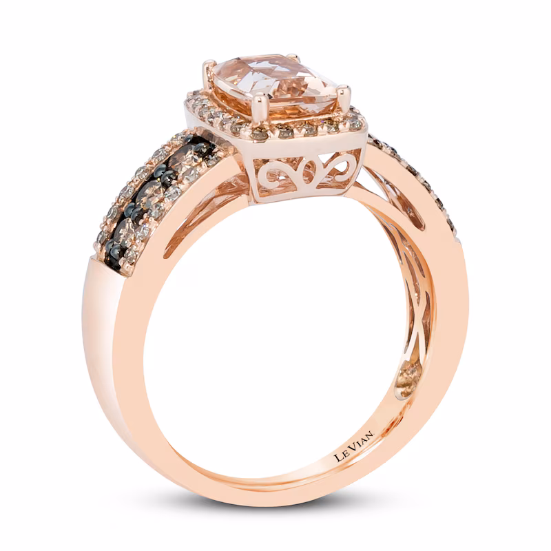A cushion-cut Le Vian® Peach Morganite⢠gemstone is the beautiful center of attention in this ring for her. Chocolate Diamonds® fan out on either side, while lines of Nude Diamonds⢠supply the finishing touches. The ring has a total diamond weight of 5/8 carat and is crafted of luscious 14K Strawberry Gold®. Le Vian®. Discover the Legend. This ring is available in limited sizes. If you don't see your size here, please visit a store to order your ring.