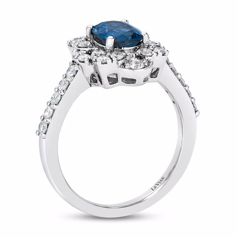 Please note: This ring is available in limited sizes. If you dont see your size here, please visit a store to order your ring. This enchanting ring from Le Vian® features a beautiful natural Blueberry Sapphire⢠haloed by irresistible Vanilla Diamonds® set in powerful platinum. Additional Vanilla Diamonds® line the band to complete the look. The total diamond weight of the ring is 5/8 carat. Le Vian®. Discover the Legend.